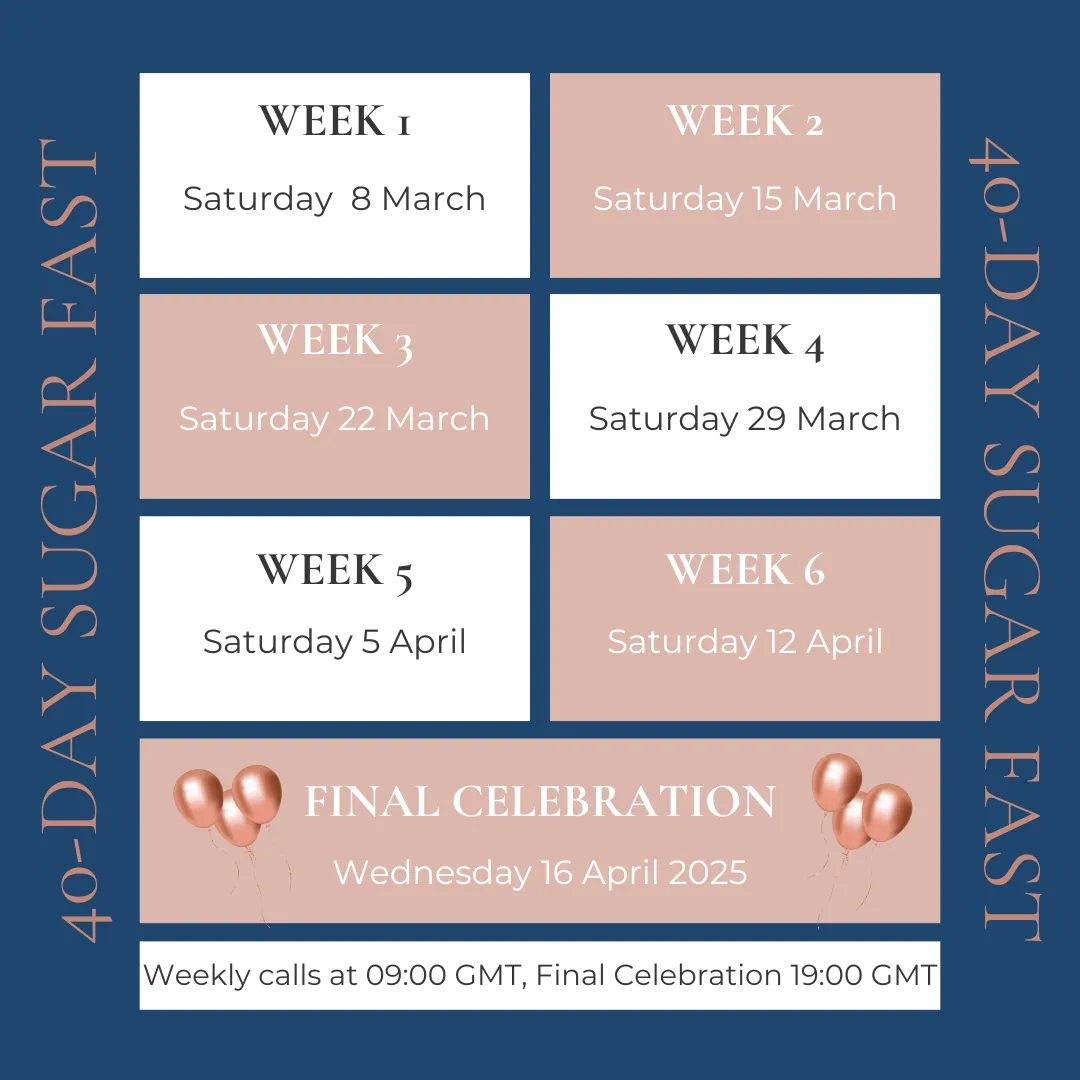 Join these weekly calls at 9am (GMT) for inspiration, motivation, and support to help you stay focused and committed to your goals. Together, we'll overcome challenges, celebrate victories, and create lasting change. Don't miss out on this opportunity to connect with your fellow sugar-fasters and fuel your journey towards a healthier, happier you. We'll share the Zoom call links each week in the WhatsApp group.